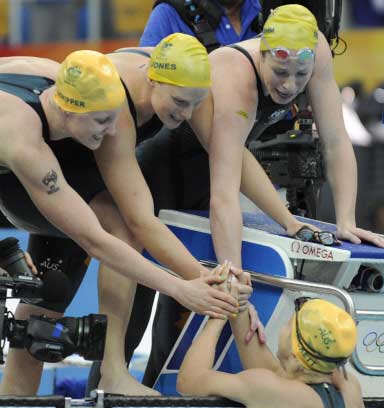 Australia's Leisel Jones (C), Jessicah Schipper (L), Lisbby Trickett (lower) and Emily Seebohm (R) react after winning the women's 4 x 100m medley relay swimming final at the National Aquatics Center during the 2008 Beijing Olympic Games in Beijing on August 17, 2008. Australia broke the world record in the women's 4x100metres medley relay with a time of three minutes 52.69 seconds in the final at the Beijing Olympics. The US team was second and China was third.[Agencies]