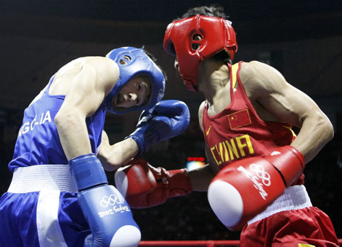 Zou Shiming (R) of China fights Purevdorj Serdamba of Mongolia during their light flyweight (48kg) final boxing match at the Beijing 2008 Olympic Games, August 24, 2008.[Agencies]