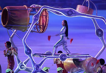 Performers dance during the closing ceremony for the 2008 Beijing Olympic Games at the National Stadium also know as the "Bird's Nest" on August 24, 2008. [Agencies]