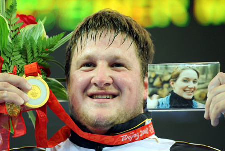 Gold medalist Matthias Steiner of Germany poses with a picture of his late wife Susann during the medal ceremony for the men's +105 kg weightlifting event during the 2008 Beijing Olympic Games in Beijing on August 19, 2008. [Agencies]