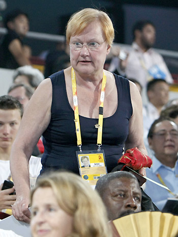 Finland's President Tarja Halonen attends the closing ceremony in the National Stadium at the Beijing 2008 Olympic Games August 24, 2008. The stadium is also known as the Bird's Nest.[Agencies]