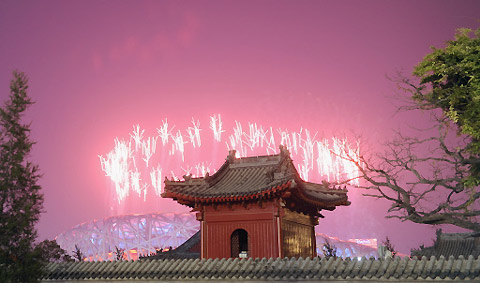 Fireworks display erupts near the "Bird's Nest" National Stadium during the closing ceremony of the 2008 Beijing Olympic Games on August 24, 2008. [Agencies]