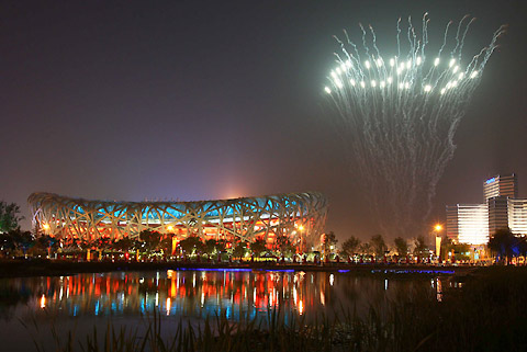 Fireworks light up the sky of the National Stadium, also known as the Bird's nest, at the start of the closing ceremony of the 2008 Beijing Olympic Games in Beijing on August 24, 2008. [Agencies]