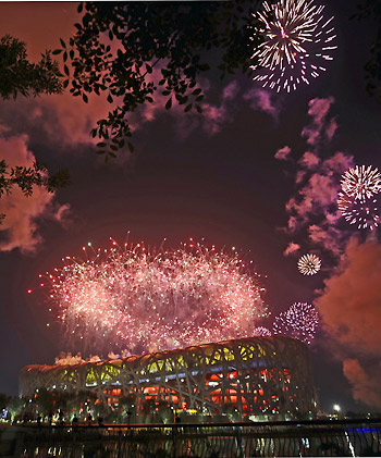 Fireworks light up the sky of the National Stadium, also known as the Bird's nest, at the start of the closing ceremony of the 2008 Beijing Olympic Games in Beijing on August 24, 2008. [Agencies]