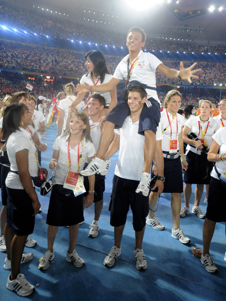 British diver Tom Daley sits on the shoulders of a team member during the closing ceremony of the Beijing 2008 Olympic Games at the National Stadium August 24, 2008.[Agencies]