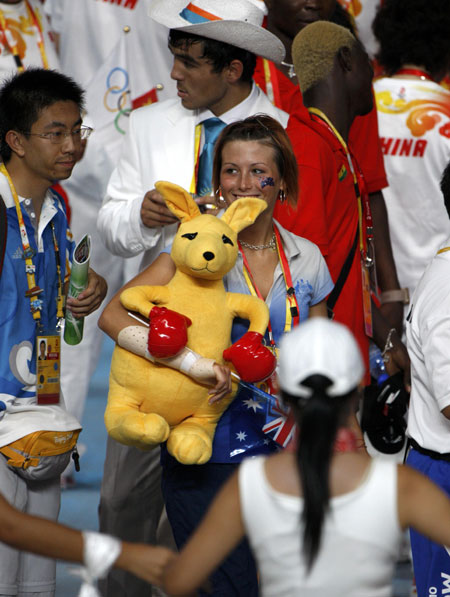 An Australian athlete carries a toy kangaroo during the closing ceremony in the National Stadium at the Beijing 2008 Olympic Games August 24, 2008.[Agencies]