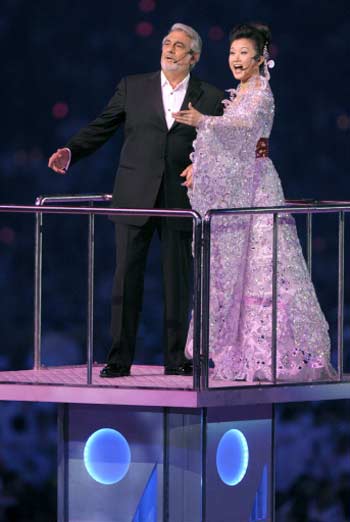 Spanish tenor Placido Domingo (L) and Chinese singer Song Zuying perform at the National Stadium or 'Birds Nest' during the closing ceremony of the 2008 Beijing Olympic Games in Beijing on August 24, 2008. London will host the 2012 Olympic Games. [Agencies]