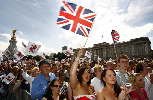 Crowds wave flags during a screening of the official handover of the Beijing Olympic Games to London in front of Buckingham Palace in London August 24, 2008.[Agencies]