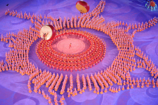 Surrounded by several thousand Olympians, all in casual wear and jubilant mood, nearly 3,000 Chinese performers and volunteers started a spectacular circle dance, around a 20-meter-tall "Memory Tower," which resembled the heaven-reaching Babel.