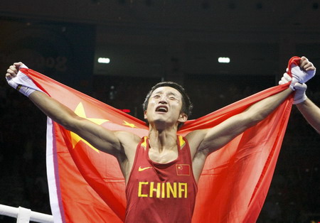 Zou Shiming of China celebrates after defeating Purevdorj Serdamba of Mongolia in their light flyweight (48kg) final boxing match at the Beijing 2008 Olympic Games, August 24, 2008. [Agencies]