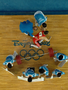 Arsen Kasabiev of Georgia (C) falls after failing a lift as volunteers use boards to hide him in the men's 94 kg weightlifting event during the 2008 Beijing Olympic Games in Beijing on August 17, 2008. [Agencies]