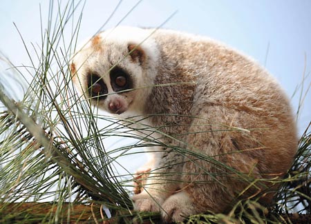 A pygmy loris looks back after winning a climbing event during an animal sports meeting at a wildlife park in Kunming, capital of Southwest China's Yunnan Province, Aug. 22, 2008. Some dozen animals in the park played on Friday for "gold medals" in events as "track and field", "gymnastics", "equestrian" and "football". [Xinhua]