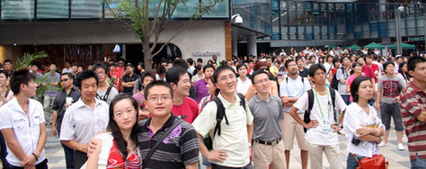 Hundreds fill the square at Sunlitun’s The Village to watch the nail-biting Olympic basketball final on Sunday, August 24, 2008. [Chinadaily.com.cn]