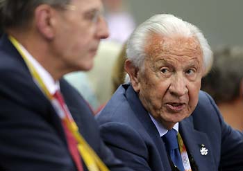 International Olympic Committee honorary president Juan Antonio Samaranch attends the men's basketball gold medal match Spain against The US of the Beijing 2008 Olympic Games on August 24, 2008 at the Olympic basketball Arena in Beijing. [Agencies]