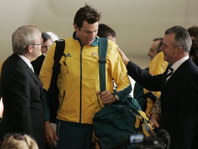 | Australia's Prime Minister Kevin Rudd (L) and leader of the opposition Brendan Nelson (R) talk with swim team captain Grant Hackett (C) during a welcome home ceremony for the Australian Olympic team at Sydney Airport August 26, 2008. [Agencies] |