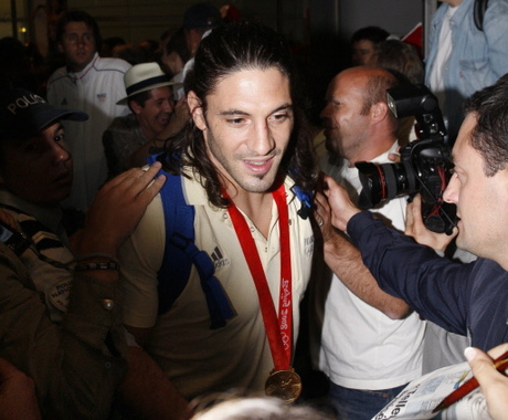 | French hanball player Bertrand Gille smiles upon his arrival from Beijing at Charles-de-Gaulle Roissy airport, outside Paris, on August 25, 2008. France defeated Iceland 28-23 to win the men's handball Olympic gold medal. [Agencies] |