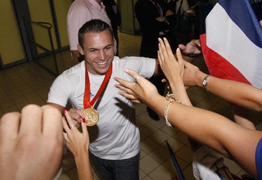 | Steeve Guenot of France smiles upon his arrival from Beijing at Charles-de-Gaulle Roissy airport, outside Paris, on August 25, 2008. Steeve Guenot won the 66kg greco-roman wrestling gold medal at the Olympic Games.[Agencies] |