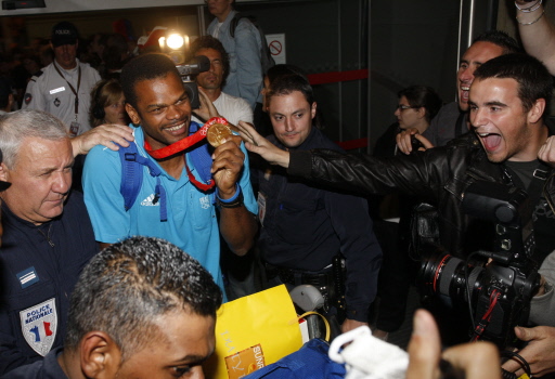 | French hanball player Joel Abati (2nd-L) smiles upon his arrival from Beijing at Charles-de-Gaulle Roissy airport, outside Paris, on August 25, 2008. France defeated Iceland 28-23 to win the men's handball Olympic gold medal.[Agencies] |