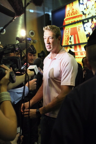Swimmer Alain Bernard (C) of France speaks to journalists upon his arrival from Beijing at Charles-de-Gaulle Roissy airport, outside Paris, on August 25, 2008. Bernard won the men's 100m freestyle gold medal at the Beijing Olympic Games, overtaking Eamon Sullivan on the closing length to triumph over the Australian world record holder. He also helped make up for French disappointment in the 4x100m freestyle relay, in which they narrowly lost out to Michael Phelps's US squad.[Agencies]
