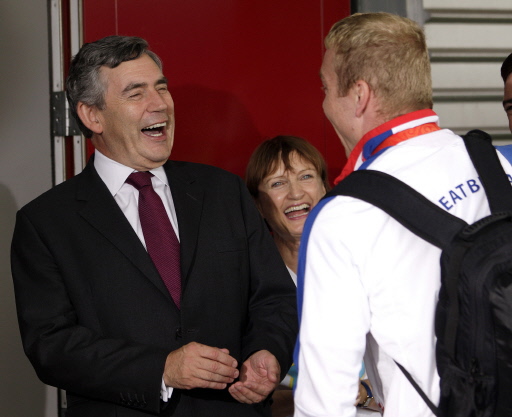 | British Prime Minister Gordon Brown (L) and Britain's Olympic Minister Tessa Jowell (C) greet Olympic team gold medal winner cyclist Chris Hoy as he arrives back in the United Kingdom at London's Heathrow airport on August 25, 2008. [Agencies] |
