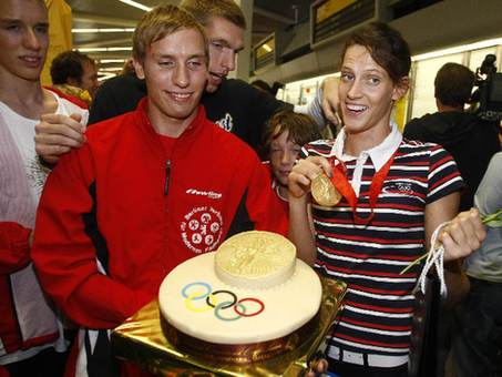 | German pentathlete Lena Schoeneborn (R) is welcomed by supporters after arriving at Berlin's Tegel airport August 25, 2008. Schoeneborn won the gold medal in the women's modern pentathlon competition at the Beijing 2008 Olympic Games. [Agencies] |