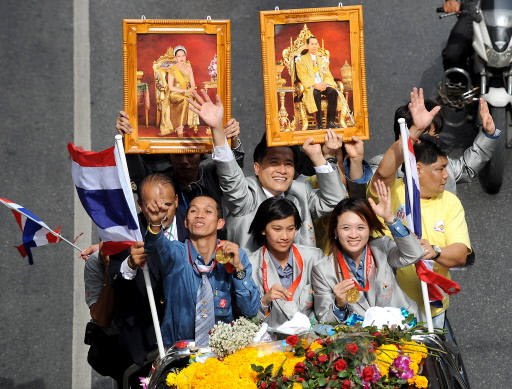 | Somjit Jongjohor,(L) who won an Olympics gold medal in Beijing for flyweight Boxing, Buttree Puedphong,(C) who won an Olympics silver medal for women's taekwondo 49 kg and Prapawadee Jaroenrattanatarakoon,(R) who won an Olympics gold medal for the women's weight lifting 53kg show their medals during a parade in Bangkok on August 25, 2008.[Agencies] |