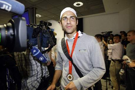 | Germany's hockey player Christopher Zeller is surrounded by media during his arrival at Frankfurt airport August 25, 2008. Zeller scored the decisive goal during his team's gold medal match at the Beijing 2008 Olympic Games.[Agencies] |