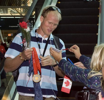 Canadian eights rower Adam Kreek is asked for autographs after arriving in Vancouver, British Columbia from Beijing August 25, 2008.[Agencies]