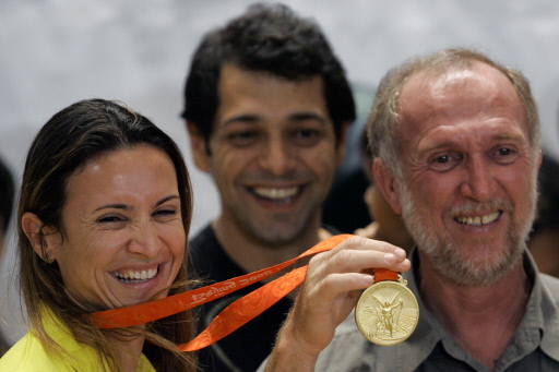 | William (R), the father of Olympic long jump gold medalist Brazilian Maurren Higa Maggi (L), shows her daughter' s medal to journalists during a press conference upon her arrival from the Beijing Olympic Games, in Sao Paulo, Brazil, on August 26, 2008. Maggi became the first Brazilian female athlete to win an olympic gold medal in an individual competition. [Agencies] |