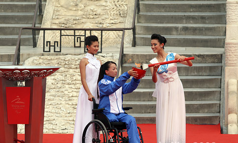 Jiang Xintian(R) lights the fire-pan carried by Jin Jing (C) at the Paralympic torch lighting ceremony at the Temple of Heaven in Beijing on August 28, 2008. [BOCOG]