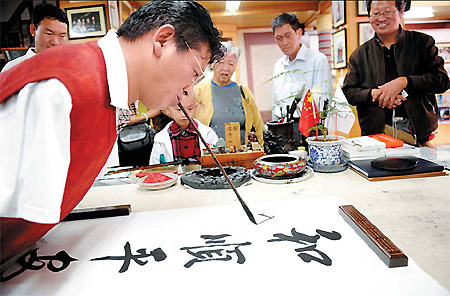 He Zhigang, who lost his arms in an accident when he was 11, practices calligraphy with a brush in his mouth on Wednesday in Lijiang, Yunnan province. The characters read "harmony and peace". He has also won more than 30 gold medals in track, field and swimming events for the disabled. Qin Qing