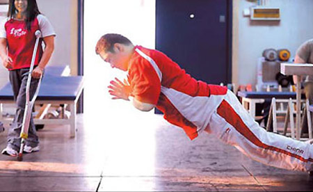 A Paralympic weightlifter does special hand-clapping pushups on Monday in Tianjin to prepare for the coming Paralympic Games. [Xinhua]