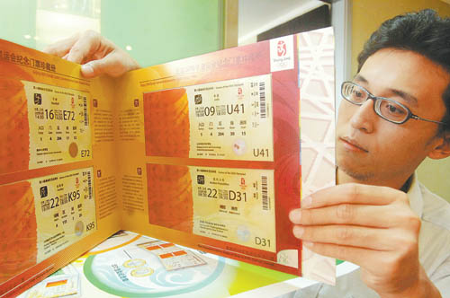 A member of the ticketing sales staff shows some Beijing Olympic commemorative tickets in Beijing, August 27, 2008. A set of 2008 Beijing Olympic Commemorative Tickets is to be issued on September 21 by China Banknote Printing and Minting. [Beijing Stardaily]