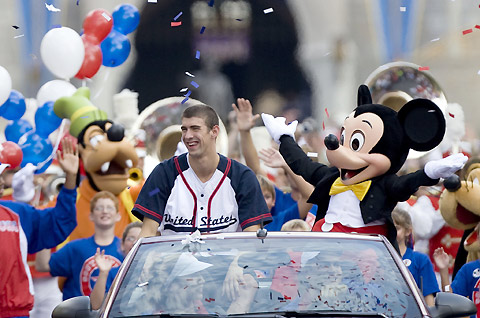 Olympic gold medal swimmer Michael Phelps rides down Main Street USA with Mickey Mouse during a parade at Walt Disney World's Magic Kingdom in Lake Buena Vista, Florida August 29, 2008. [Agencies]