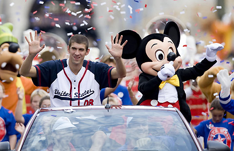 Olympic gold medal swimmer Michael Phelps (C) rides down Main Street USA with Mickey Mouse during a parade at Walt Disney World's Magic Kingdom in Lake Buena Vista, Florida August 29, 2008. [Agencies]