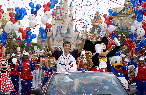 Olympic gold medal swimmer Michael Phelps (C) rides down Main Street USA with Mickey Mouse during a parade at Walt Disney World's Magic Kingdom in Lake Buena Vista, Florida August 29, 2008. [Agencies]