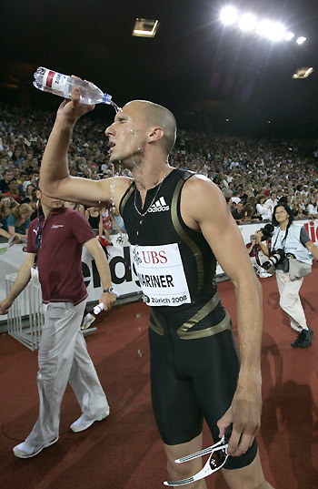 Jeremy Wariner of the US pours water over his head after winning the men's 400m event at the IAAF Golden League athletics meeting at the Letzigrund stadium in Zurich, August 29, 2008. [Agencies]