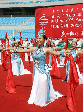 Dancers dressed in Mongolian ethnic costumes greet the Paralympic torch as it passes through Hohhot, Inner Mongolia Autonomous Region, August 30, 2008. [Xinhua]