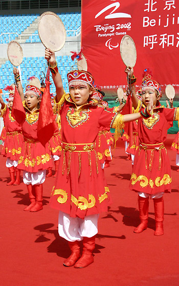 Children dressed in Mongolian ethnic costumes welcome the Paralympic torch as it passes through Hohhot, Inner Mongolia Autonomous Region, August 30, 2008. [Xinhua]