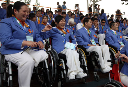 Chinese athletes attend the opening ceremony of the athletes' village for the Beijing Paralympics in Beijing, August 30, 2008. [Xinhua]