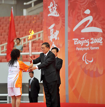 Li Hongzhong, governor of Hubei province, presents the torch to Cheng Yu, the former table tennis gold medalist of 1988 Paralympics. The Beijing Paralympic torch relay in Wuhan started at 8:06 a.m.on Sunday at Wuhan Sports Center in central China's Hubei province. [Xinhua]