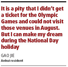"It is a pity that I didn't get a ticket for the Olympic Games and could not visit those venues in August. But I can make my dream during the National Day holiday," Gao said.