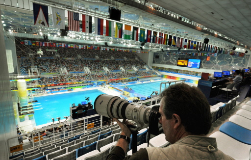 Greg Wood shoots the diving events inside the National Aquatics Center, also known as the "Water Cube", during the 2008 Beijing Olympic Games in Beijing in this August, 2008 file photo. [Agencies]