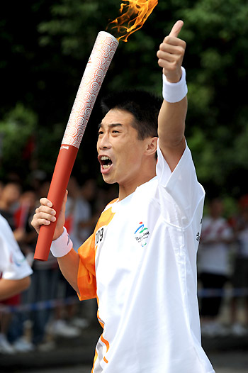 Xia Hongxing,a role model soldier, thumbs-up during his leg of Beijing Paralympic torch relay in Shanghai on September 1, 2008. [Xinhua]