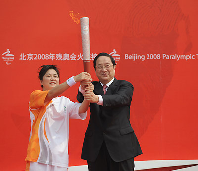 Yu Zhengsheng(L), the governor of Shanghai passes the torch to Zhao Jihong. The Paralympic torch relay started its tour in Shanghai on September 1,2008. [Xinhua]