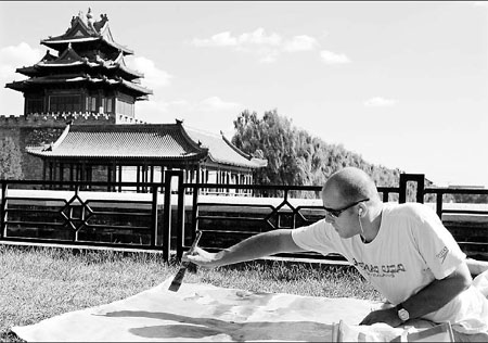 History on canvas: Former American Paralympian Gregory Burns paints a section of the Forbidden City in Beijing on Sunday. He is the Paralympic ambassador of BHP Billiton Ltd, the sponsor of the medals for the Olympic and Paralympic Games. Xinhua
