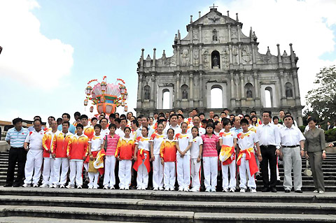 China's Olympic gold medalists pose for photograghers in front of Dasanba, a popular tourist attraction, September 1, 2008. [Xinhua]