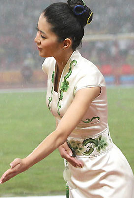 A volunteer gestures at the awarding ceremony inside the National Stadium, or the Bird's Nest, during the Paralympic Games in Beijing, September 9, 2008. [Sohu.com]