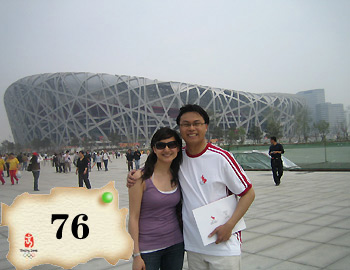 Cousins from the Liu family but of different countries meet in front of the Bird's Nest, the National Stadium. |