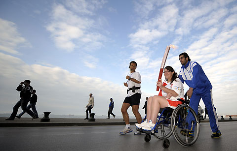 Greek paralympic athlete Maria Kalpakidou carries the Beijing 2008 Olympic torch in Thessaloniki, about 500 km (311 miles) north of Athens, March 28, 2008. The flame for the Beijing 2008 Games was lit earlier this week in Olympia, the site of the ancient Games. [Agencies]